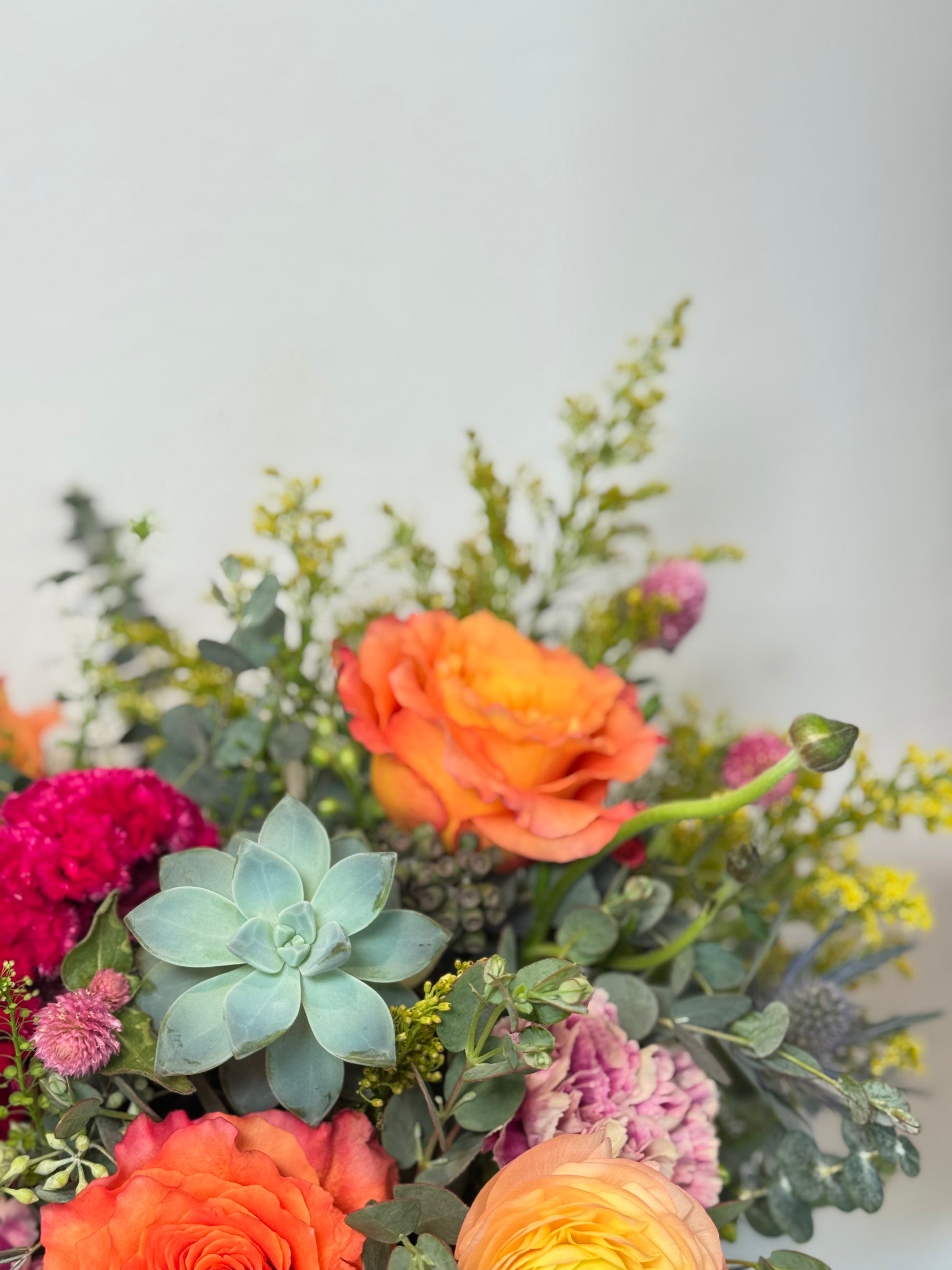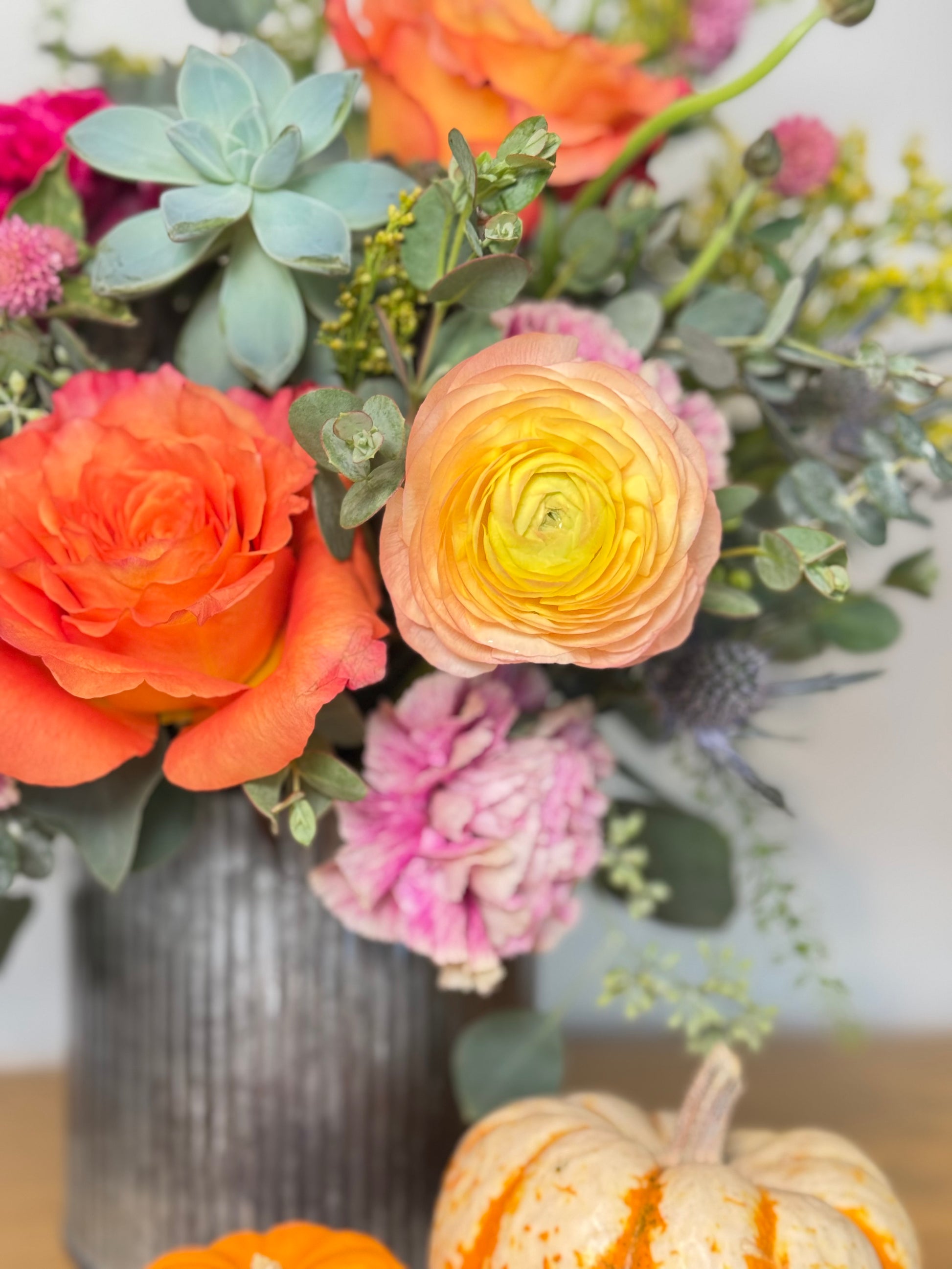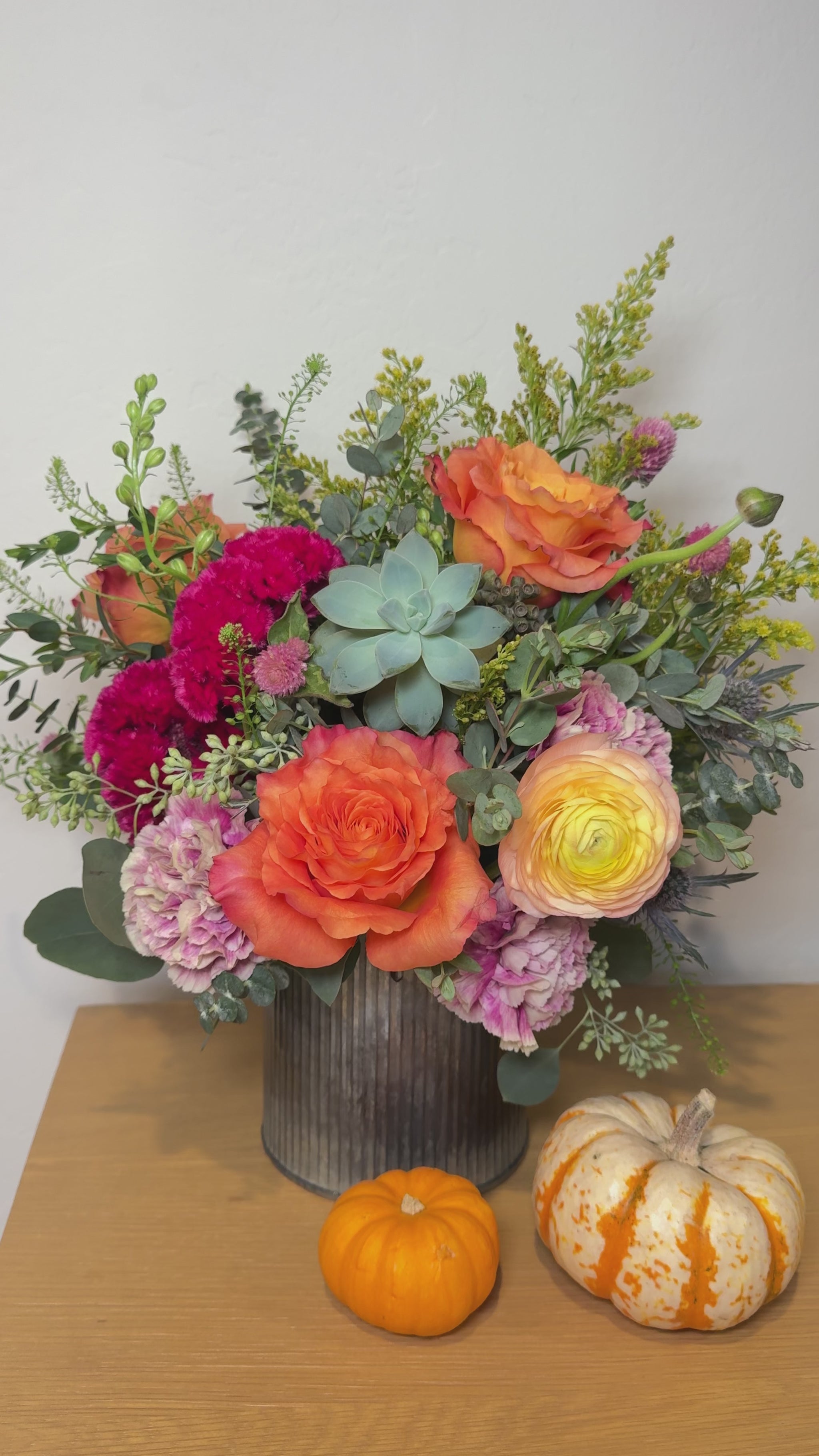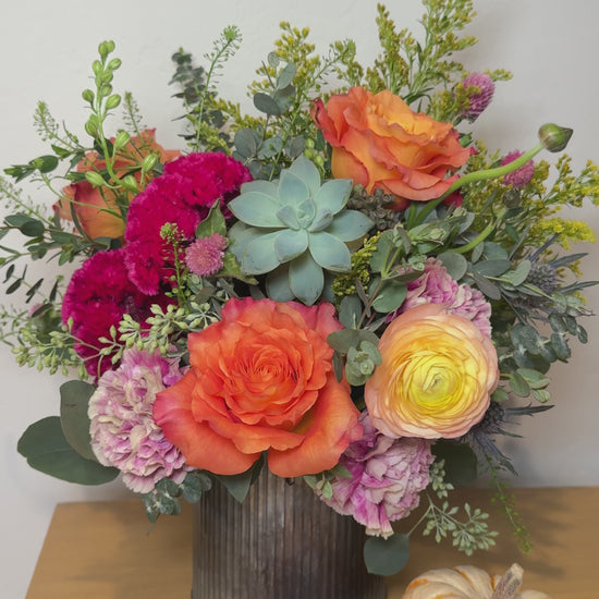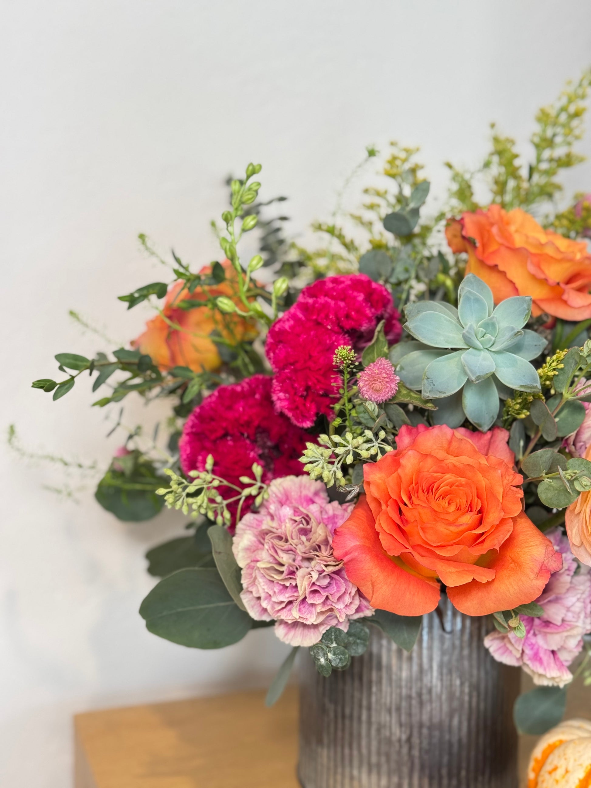 Bring the glow of a seaside autumn evening into any space with our Cranberry Sunset arrangement. Designed in a charming tin vase, this bouquet blends succulents, roses, playful carnations, and fresh seasonal blooms like celosia and gomphrena (varieties may vary).