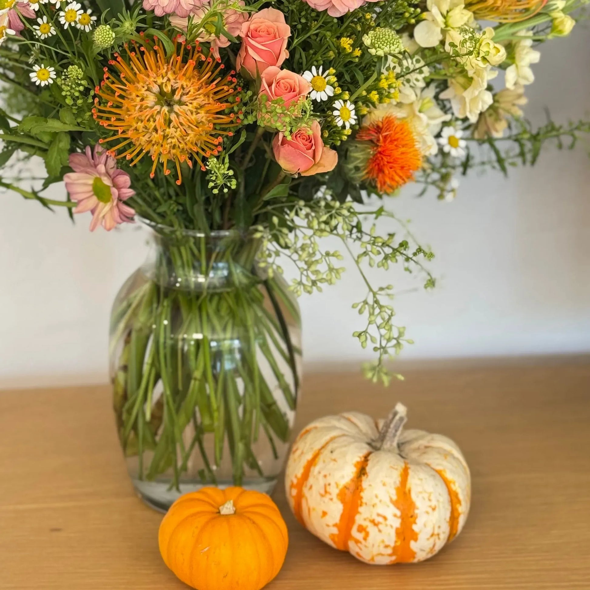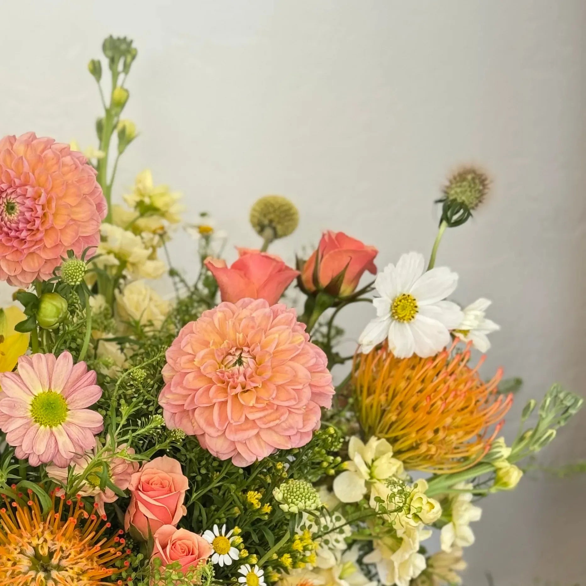 A whimsical wildflower-style arrangement that feels like a stroll through a late-summer meadow. Designed with airy greenery and peachy tones, it features favorites like dahlias, spray roses, pincushions, and seasonal blooms such as cosmos. Each piece is full of texture, movement, and that just-picked charm.